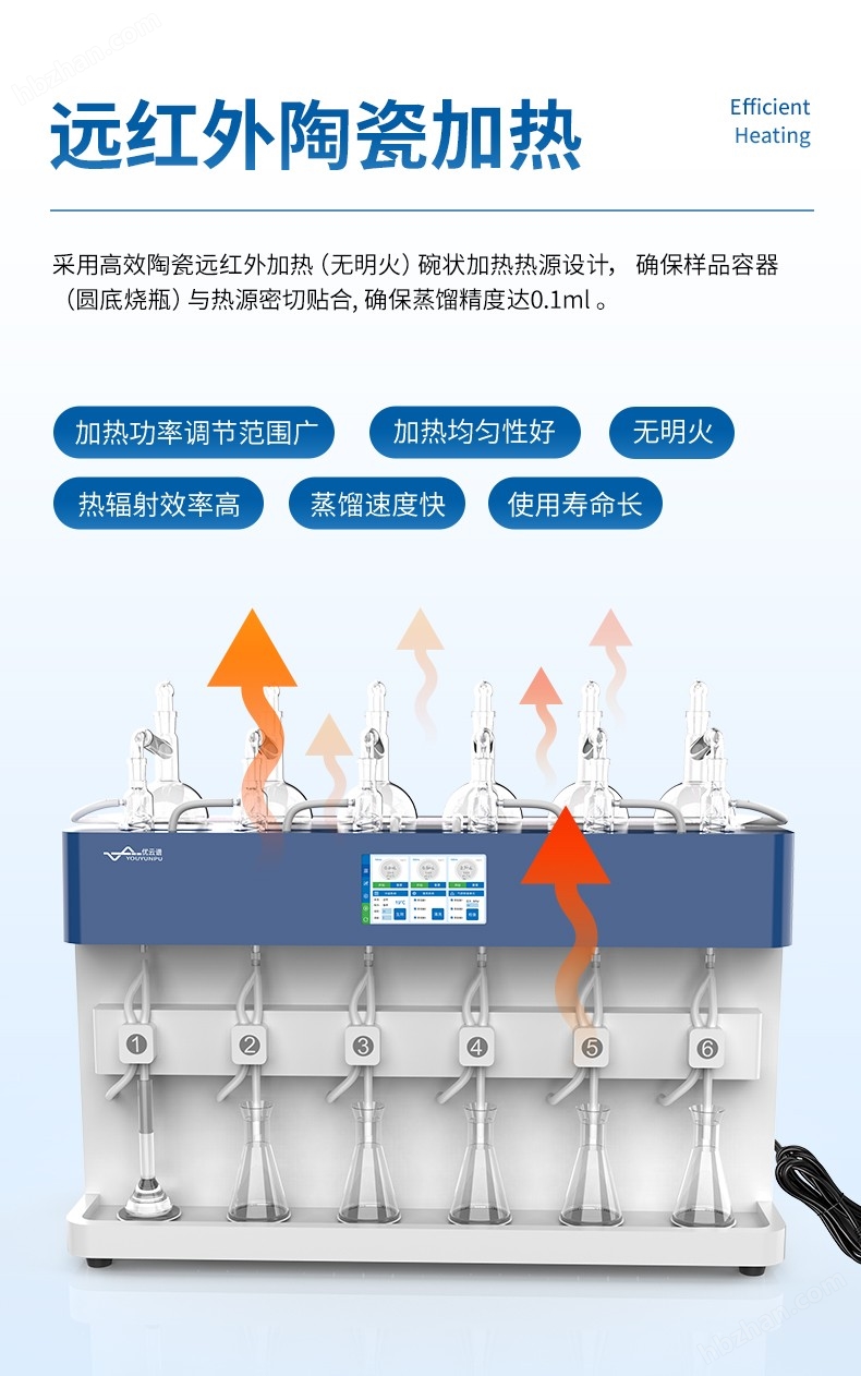 3、加熱模塊采用遠紅外陶瓷輻射加熱方式,碗狀加熱熱源設計,確保樣品容器(圓底燒瓶)與熱源密切貼合,加熱功率調(diào)節(jié)范圍廣、加熱均勻性好、熱輻射效率高,蒸餾速度快、使用壽命長。