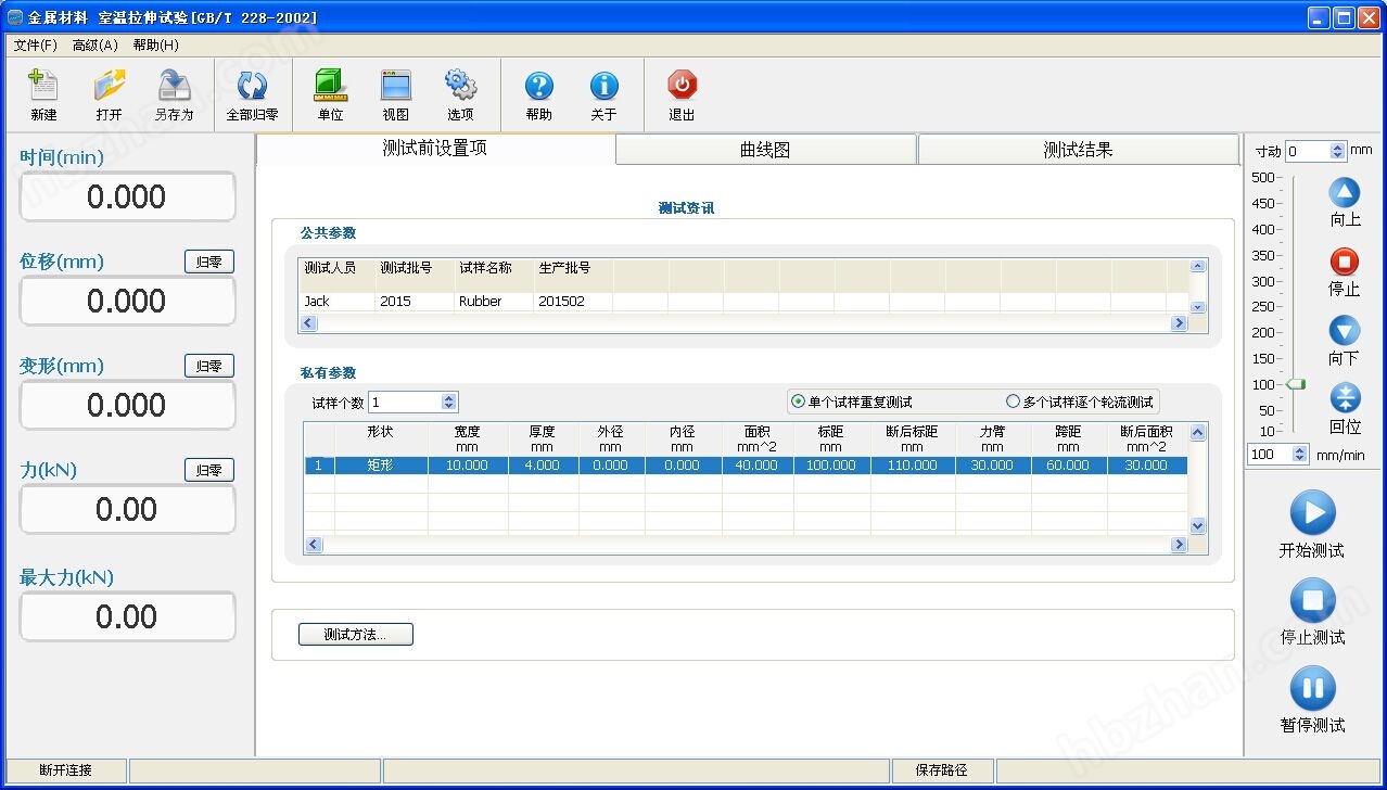 7.測試結(jié)束可自動存檔、手動存檔,測試完畢自動求算力量、上、下屈服強(qiáng)度、環(huán)法、逐步逼近法、非比例延伸強(qiáng)度、抗拉強(qiáng)度、抗壓強(qiáng)度、任意點(diǎn)定伸長強(qiáng)度、定負(fù)荷延伸、彈性模量、延伸率、剝離區(qū)間值、最小值、平均值、凈能量、總能量、彎曲模量、斷點(diǎn)位移x%荷重、斷點(diǎn)荷重X%位移、等等。備份:測試數(shù)據(jù)可保存在任意硬盤分區(qū)。
