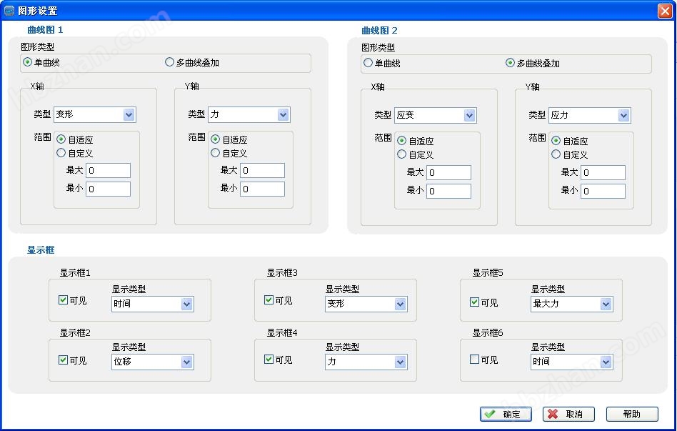 5.圖形曲線尺度自動化(Auto Scale),可使圖形以尺度顯示。并可于測試中實(shí)時圖形動態(tài)切換。具有荷重-位移、荷重-時間、位移-時間、應(yīng)力-應(yīng)變荷重-2點(diǎn)延伸圖,以及多曲線對比。