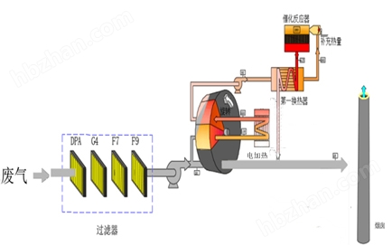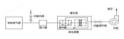 本裝置由主機(jī)、引風(fēng)機(jī)及電控柜組成,凈化裝置主機(jī)由換熱器、催化床、電加熱元件、阻火阻塵器和泄壓裝置等組成,阻火除塵器位于進(jìn)氣管道上,泄壓裝置設(shè)在主機(jī)的頂部,其單套主機(jī)工藝流程示意圖如下: