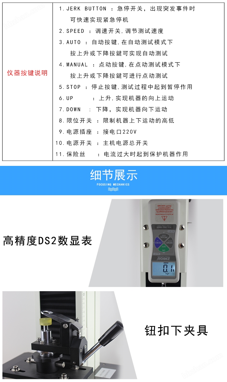 ZQ-770-3鈕扣拉力試驗(yàn)機(jī)機(jī)臺(tái)采用全新設(shè)計(jì),外型優(yōu)美。動(dòng)力系統(tǒng)采用調(diào)速電機(jī)+滾珠絲桿+光桿直線軸承,具有體積小、結(jié)構(gòu)緊湊、穩(wěn)定性好、噪音低、操作方便等優(yōu)點(diǎn)。功能上可通過調(diào)速開關(guān)控制測(cè)試速度的快慢,同時(shí)具有手動(dòng)測(cè)試和自動(dòng)測(cè)試兩種測(cè)試功能,通過機(jī)器上的限位開關(guān)可實(shí)現(xiàn)到位停機(jī)。力傳感器部份采用智取品牌一代DS2系列推拉力計(jì)。誤差可控制在0.5%以內(nèi),采樣速率可達(dá)1000次/秒。機(jī)器配有鈕扣專用夾具,用于測(cè)量鈕扣的扣合力或脫離衣物破壞力,同時(shí)可以選配各種夾具,對(duì)玩具類/服裝類/帽子/鞋子等產(chǎn)品上飾品或鈕扣類配件進(jìn)行拉力測(cè)試。廣泛應(yīng)用在嬰兒和兒童服裝制造中防止出現(xiàn)質(zhì)量問題使嬰兒和兒童吞食或出現(xiàn)其他危險(xiǎn)情況。