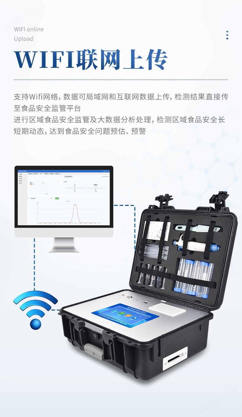 3、直流12V供電,可連接車(chē)載電源。4、脈沖式恒流驅(qū)動(dòng),避免連續(xù)發(fā)光引起光衰和溫漂。5、內(nèi)置國(guó)家標(biāo)準(zhǔn),可繼續(xù)更新。6、可設(shè)置密碼登錄7、不間斷進(jìn)樣,連續(xù)檢測(cè)8、樣本編號(hào)自動(dòng)累加。9、檢測(cè)項(xiàng)目可擴(kuò)充。10、檢測(cè)結(jié)果可批量打印,批量上傳。11、檢測(cè)結(jié)果為Excel表格,連接電腦即可拷貝。12、檢測(cè)結(jié)果存儲(chǔ)容量20萬(wàn)條13、支持Wifi網(wǎng)絡(luò),數(shù)據(jù)可局域網(wǎng)和互聯(lián)網(wǎng)數(shù)據(jù)上傳,檢測(cè)結(jié)果直接傳至食品安全監(jiān)管平臺(tái)。進(jìn)行區(qū)域食品安全監(jiān)管及大數(shù)據(jù)分析處理,檢測(cè)區(qū)域食品安全長(zhǎng)短期動(dòng)態(tài),達(dá)到食品安全問(wèn)題預(yù)估、預(yù)警14、高速熱敏打印機(jī),檢測(cè)完成可自動(dòng)打印檢測(cè)報(bào)告。15、標(biāo)準(zhǔn)USB接口,免驅(qū)動(dòng)安裝。