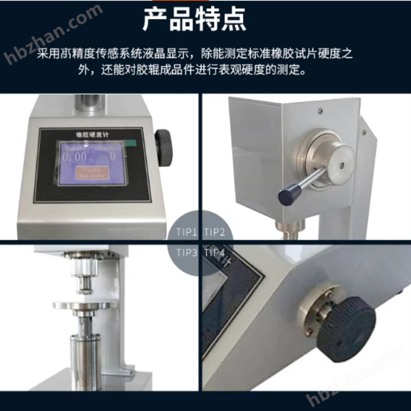采用精度傳感系統(tǒng)液晶顯示,除能測定標(biāo)準(zhǔn)橡膠試片硬度之外,還能對膠輥成品件進(jìn)行表觀硬度的測定。