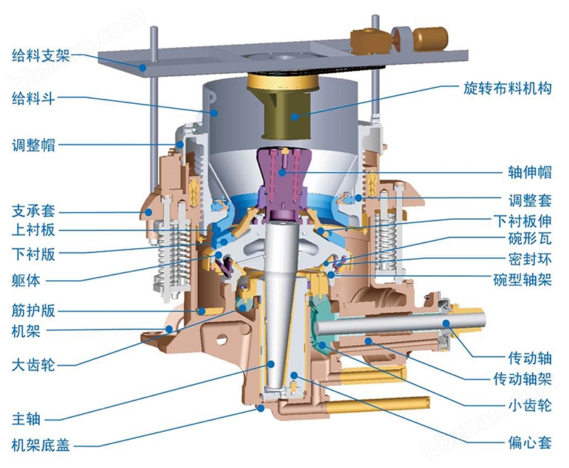 旋盤式破碎機(jī)之所以能夠?qū)崿F(xiàn)層壓破碎,在于其獨(dú)特的設(shè)計(jì)結(jié)構(gòu):