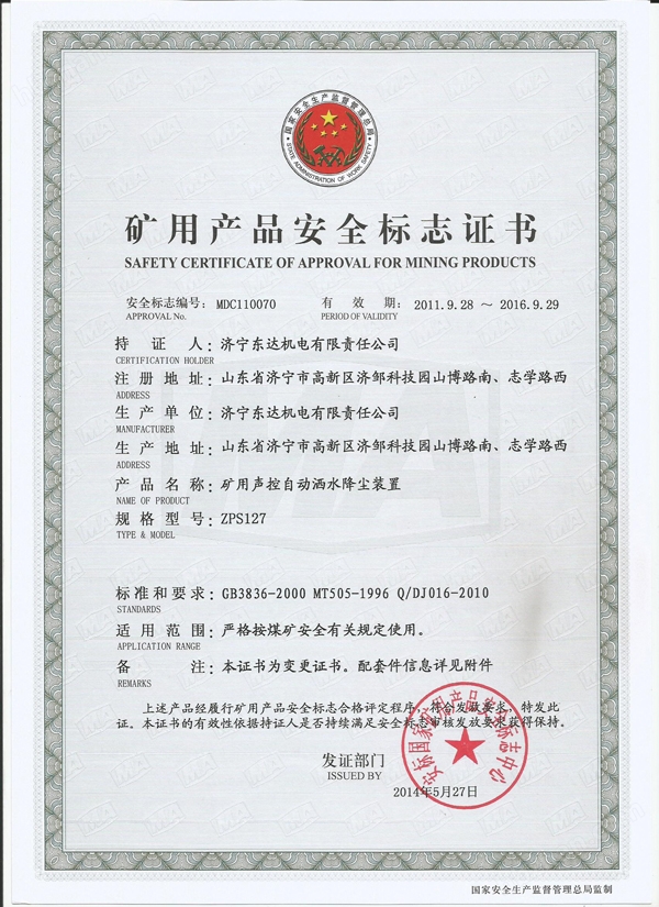 裝置采用集成電路、選頻放大,抗干擾性好,使用方便,電磁閥承受水壓能力強,動作靈活可靠。裝置嚴格遵循GB3836.1-2000《爆炸性氣體環(huán)境用電氣設備di1部分通用要求》、GB3836.2-2000《爆炸性氣體環(huán)境用電氣設備第2部分隔爆型“d”》、 GB3836.4-2000《爆炸性氣體環(huán)境用電氣設備第4部分本質安全型“i”》、MT505-1996《自動噴霧降塵裝置通用技術條件》和Q/DJ016-2010《ZPS127礦用自動灑水降塵裝置》的規(guī)定進行設計和制造。