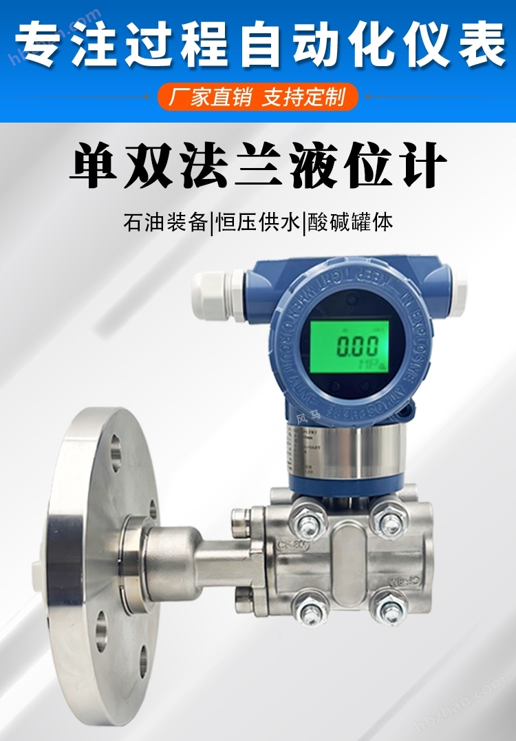 ?單法蘭液位計(jì)?:結(jié)構(gòu):僅一個(gè)法蘭(H端)直接接觸介質(zhì),低壓側(cè)(L端)通大氣,無(wú)毛細(xì)管。??原理:測(cè)量介質(zhì)靜壓力(??=?????P=hρg),通過(guò)H端與大氣壓差計(jì)算液位高度。??