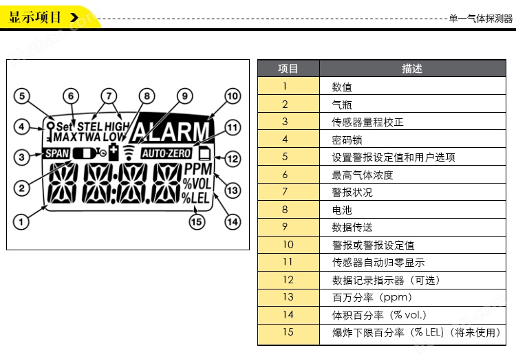 ◆視覺報警:閃爍、廣角警報透鏡和兩個紅色LED警示燈及警報LCD讀數(shù)