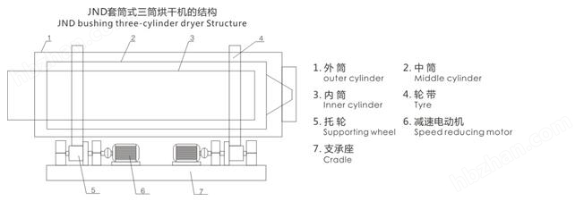 套筒式三筒烘干機的烘干過程:被烘干的物料由入料端喂入烘干機內(nèi)筒,物料通過內(nèi)筒的螺旋導向板進入內(nèi)筒,內(nèi)筒內(nèi)部設有許多螺旋狀揚料板,物料通過筒體的回轉,被揚料板不斷的撥起并作縱向運動,物料到達內(nèi)筒的左端因自重的作用落入中筒,通過導向板,在筒體回轉作用下物料被推回中筒,在中筒揚料板的作用下物料向右運動,直到中筒右端,物料在自重作用下落入外筒。同樣道理,物料在外筒螺旋揚料板的作用下折回向左運動,直到外筒左端。在導料板的作用下落入出料端筒體內(nèi)。烘干機主體的1、2、3。三個同心圓筒內(nèi),設有不同數(shù)量、不同角度的曲面螺旋狀揚料板,每個筒體的端部設有導向板。套筒式三筒烘干機的主體通過兩個減速電機6,分別驅(qū)動兩端的兩個傳動托輪5,使輪帶4繞中心轉動。待烘干機的濕物料經(jīng)喂料設備,即入料管喂入內(nèi)筒3的入料端時,濕物料通過螺旋導向板迅速推向螺旋揚料板。隨著筒體的旋轉,物料被筒內(nèi)的螺旋式揚料板舉升的同時,不斷的翻滾、拋散、并向出料端作縱向運動。與此同時從熱風爐來的熱氣流,先后進入內(nèi)筒3、中筒2、外筒1與物料進行強烈的熱交換。由于金屬鋼板比被烘干的物料導熱快,筒體的鋼板、揚料板首先受熱,然后又把熱量以傳導和輻射的方式傳給物料,物料受熱后溫度升高,當溫度升高到水份蒸發(fā)的溫度時,水蒸汽從物料中分離出來,隨煙塵經(jīng)除塵器后排入大氣中,從而達到物料烘干的目的。