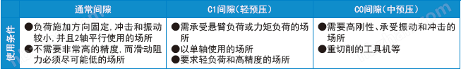 由于直線導(dǎo)軌的徑向間隙能夠極大地影響直線導(dǎo)軌的行走精度、負(fù)荷承載能力和剛性,因而根據(jù)用途選擇適當(dāng)?shù)拈g隙就十分重要。一般說來,考慮到往復(fù)運(yùn)動可能產(chǎn)生的振動和沖擊,選擇負(fù)間隙(即施加預(yù)壓 ),就能對使用壽命和精度產(chǎn)生良好的影響。