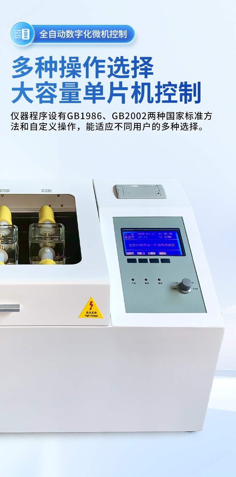 3. 多種操作選擇,儀器程序設有GB1986、GB2002兩種國家標準方法和自定義操作,能適應不同用戶的多種選擇;