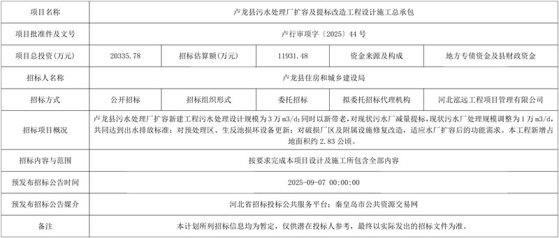 湖北省通山縣第二生活污水處理廠建設(shè)項目(EPC)評標結(jié)果公示,合同估算價:17249.19萬元。河北昌黎縣靖安生活污水處理對標污水處理綠色低碳標桿廠項目EPC總承包招標