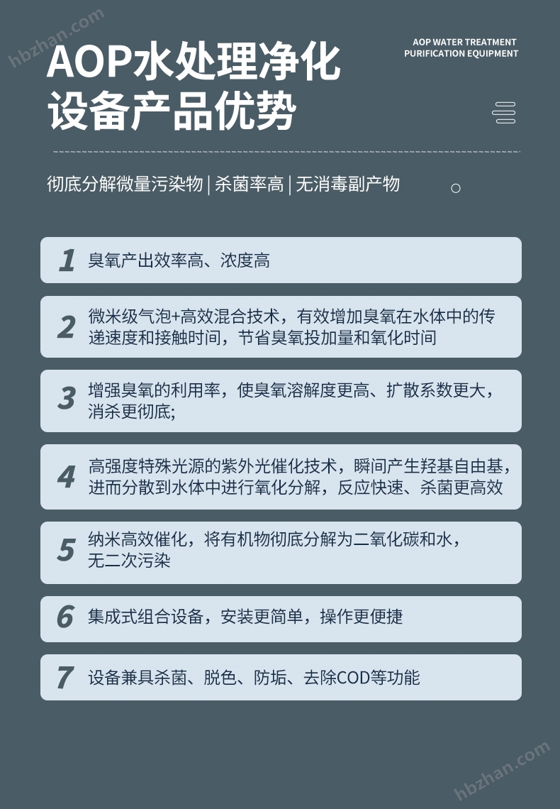 設(shè)備結(jié)構(gòu):通常含反應(yīng)腔、紫外燈組 / 臭氧發(fā)生器、藥劑投加(如 H?O?)、催化劑模塊、流量 / 濃度監(jiān)測與自動控制系統(tǒng)。
