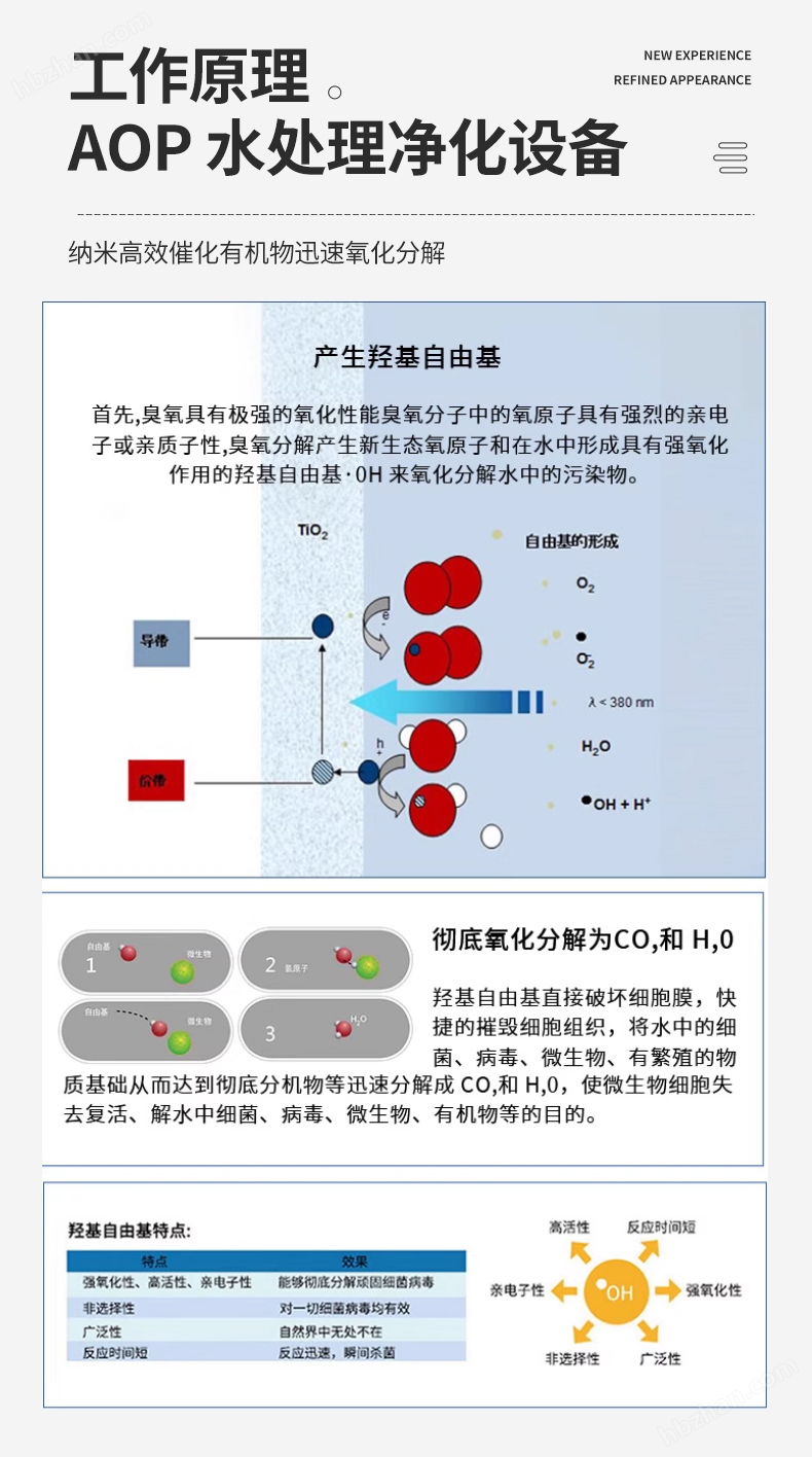 自由基主導(dǎo):?OH 無選擇性攻擊微生物細胞壁、核酸,氧化分解農(nóng)藥、抗生素、內(nèi)分泌干擾物,最終礦化為 CO?、H?O 與無機鹽;