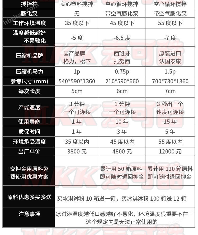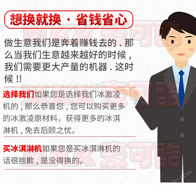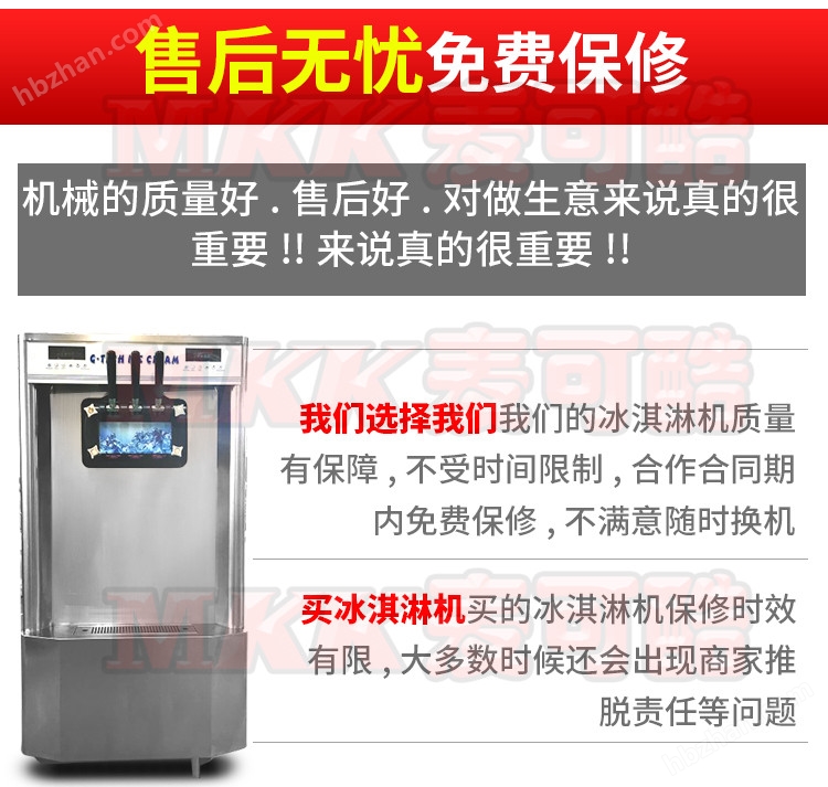 業(yè)務(wù)說:冰淇淋口感好有秘訣,主要是看膨化率,刮刀攪拌柱,內(nèi)循環(huán)空氣膨化,就比如蒸雞蛋,我們平時到酒店吃的蒸雞蛋細(xì)膩滑口,為什么自己家里自己做的不大一樣,甚至硬硬的就是不好吃?因?yàn)闆]有膨化的原因你可以理解嗎?還有我們平時吃的面包也是一樣原理,如果沒有膨化好的面包也是硬邦邦的,咬都咬不進(jìn)去怎么吃啊?更別說好吃啦,冰淇淋也是一樣目前除了麥當(dāng)勞,肯德基,DQ這些大公司有的機(jī)器10多萬一臺,平時老板姓哪舍得花這個錢買機(jī)器,遇到我你走運(yùn)了,目前麥可酷是可以做到這種膨化技術(shù)的,不怕你對比,今天你如果需要買冰淇淋機(jī)你可以把我的買回去如果達(dá)不到麥當(dāng)勞的口感你隨時退貨,如果因?yàn)榭诟袉栴}達(dá)不到的我還可以賠你來回運(yùn)費(fèi),你還不信就過來我們一起去麥當(dāng)勞那邊對比都可以,我肯定你對比完了會說我們的口感比那個還要好一點(diǎn)。