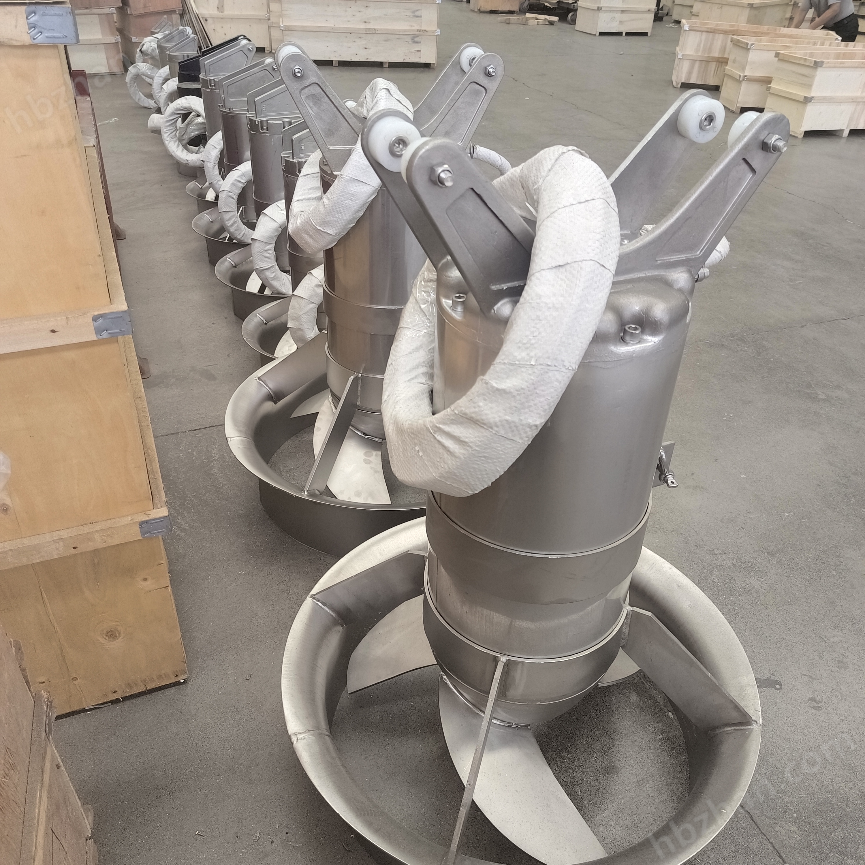 2、潛水式安裝的攪拌機(jī)可通過吊機(jī)或起吊架直接將攪拌機(jī)吊入位置,依靠設(shè)備自重定位,固定好電纜。