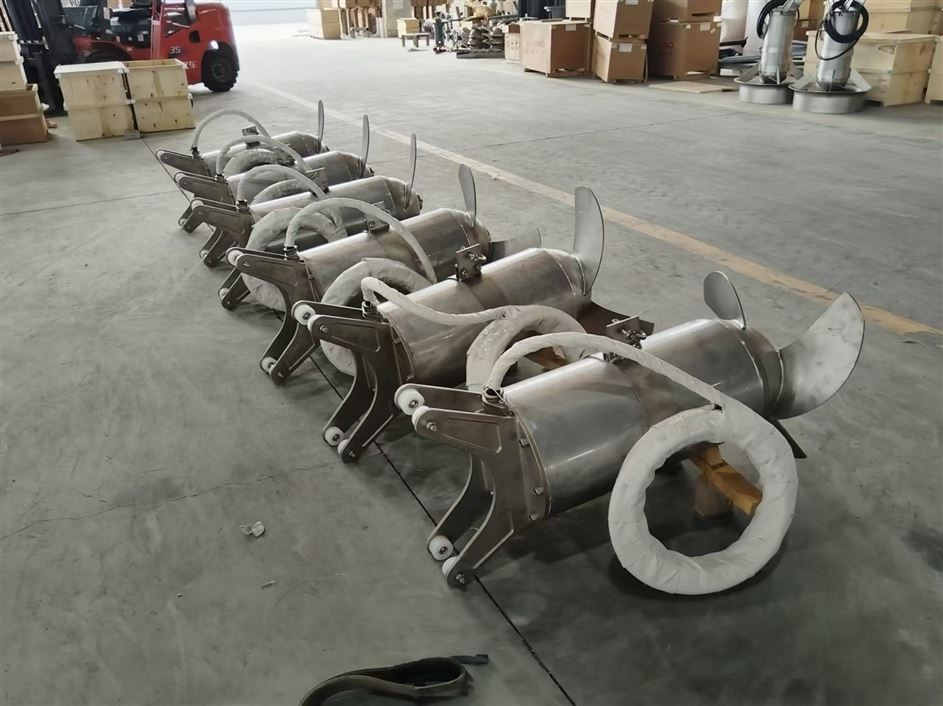 4 電機(jī)繞組絕緣等級F級,防護(hù)等級為IP68,在污水廠的曝氣系統(tǒng)中配合使用,可使系統(tǒng)能耗大大降低,且充氧量明顯提高,能有效的防止沉淀。根據(jù)工藝要求,直聯(lián)式潛水?dāng)嚢杩膳溆脤?dǎo)流罩。